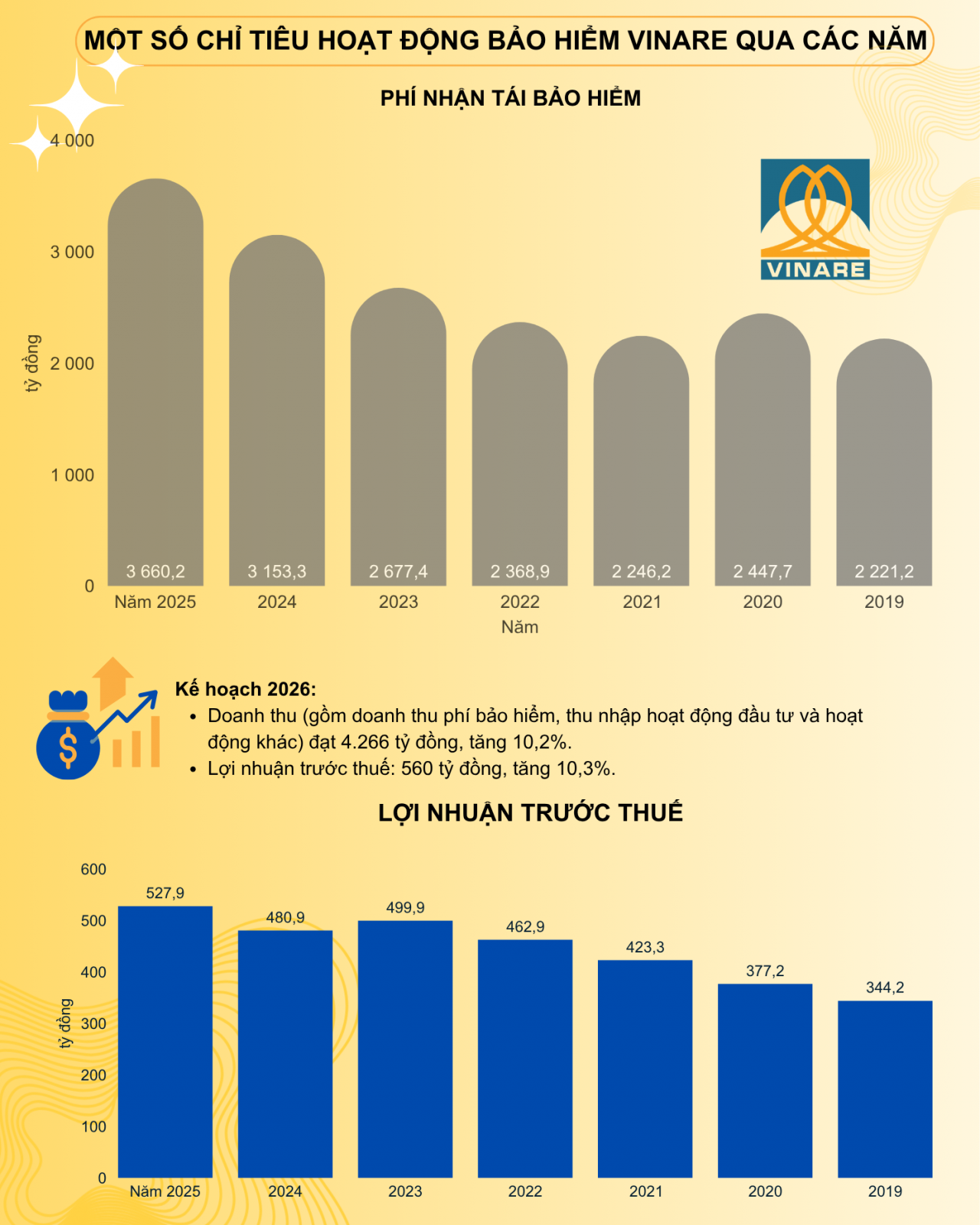 Năm 2026, VINARE đặt mục tiêu doanh thu, trong đó gồm doanh thu phí bảo hiểm, đạt 4.266 tỷ đồng, tăng 10,2%; lợi nhuận trước thuế 560 tỷ đồng, tăng 10,3% và duy trì cổ tức tiền mặt 10%. Trước đó, dù chịu tác động từ thiên tai diễn biến phức tạp, doanh nghiệp vẫn hoàn thành vượt kế hoạch kinh doanh năm 2025.