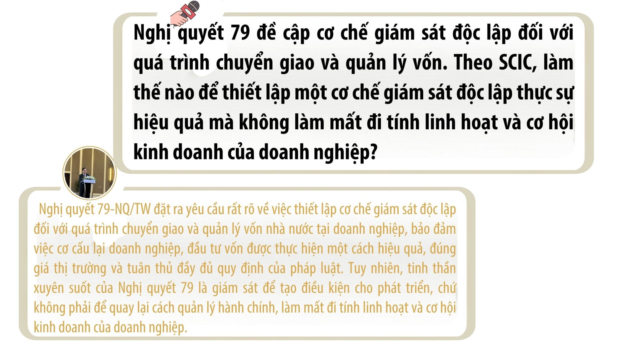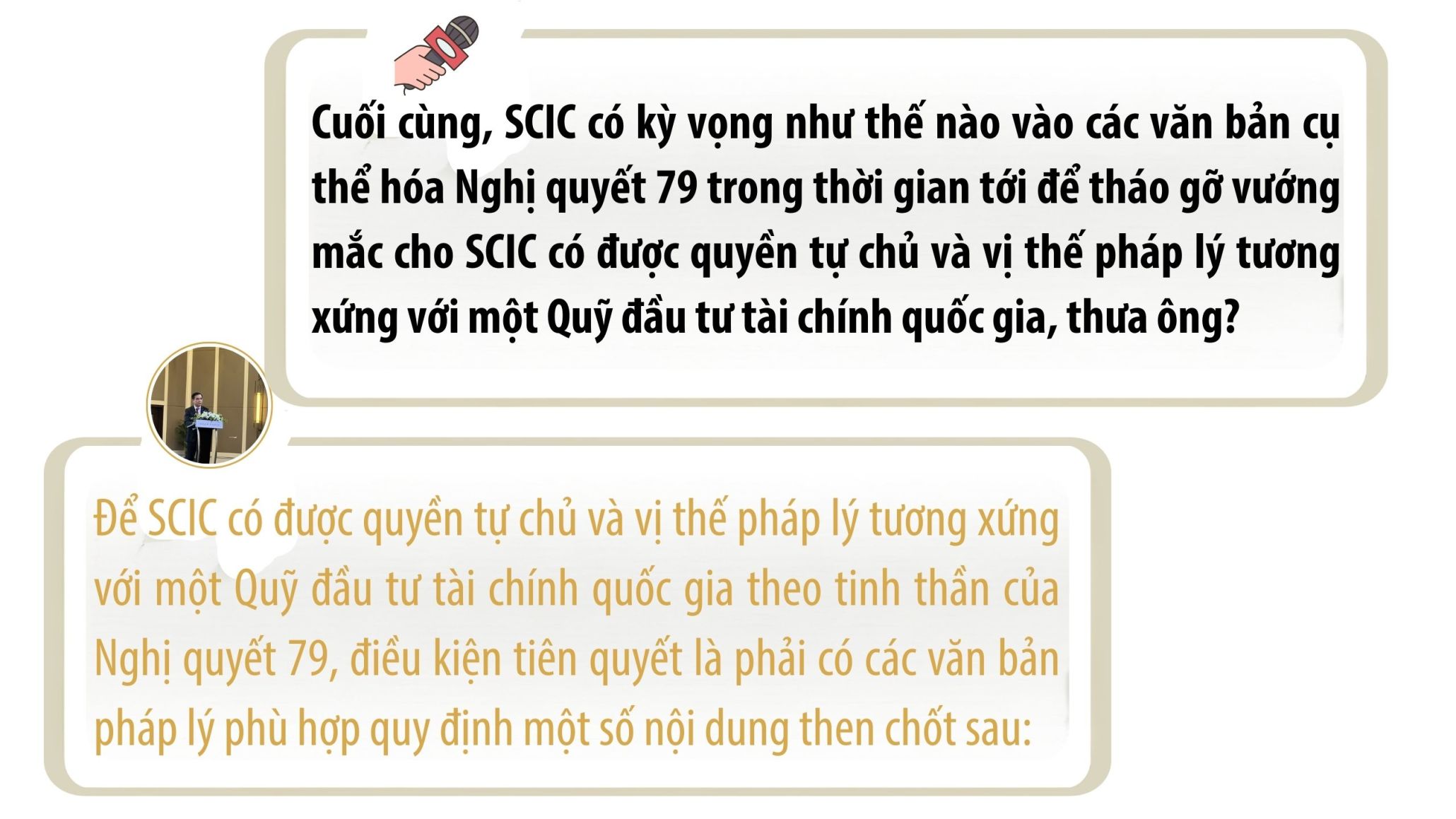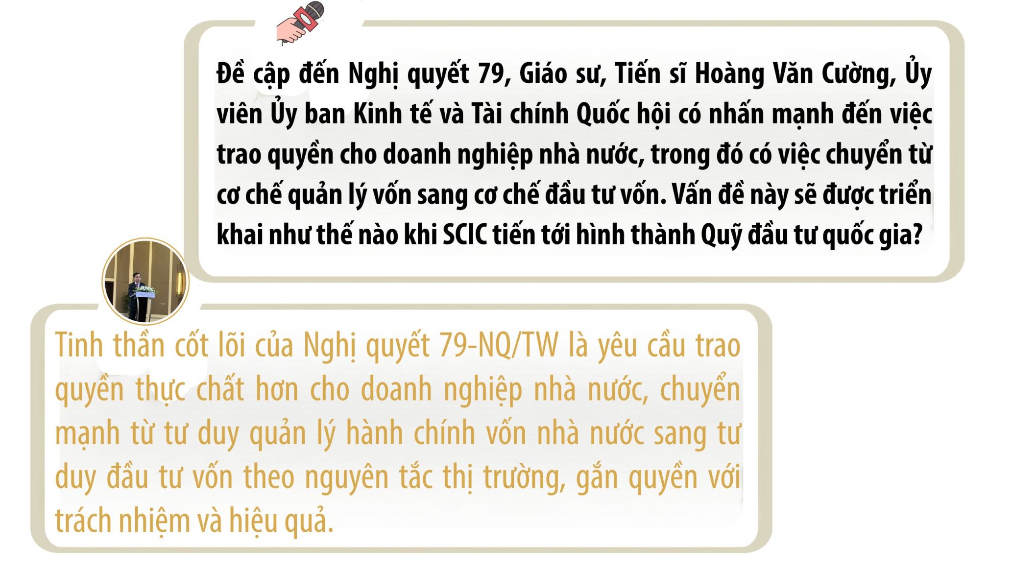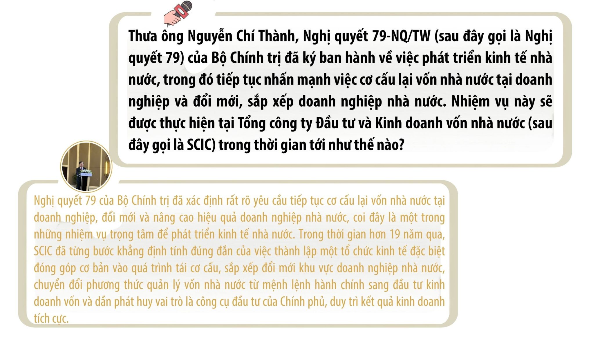 Cuối cùng, triển khai nhiệm vụ này gắn với định hướng đổi mới mô hình hoạt động của SCIC theo tinh thần Nghị quyết 79, từng bước phát triển SCIC theo hướng một định chế đầu tư vốn nhà nước chuyên nghiệp, vận hành theo nguyên tắc thị trường, có khả năng huy động và phân bổ nguồn lực hiệu quả cho các mục tiêu phát triển kinh tế-xã hội trong trung và dài hạn, hướng tới hình thành Quỹ đầu tư quốc gia.