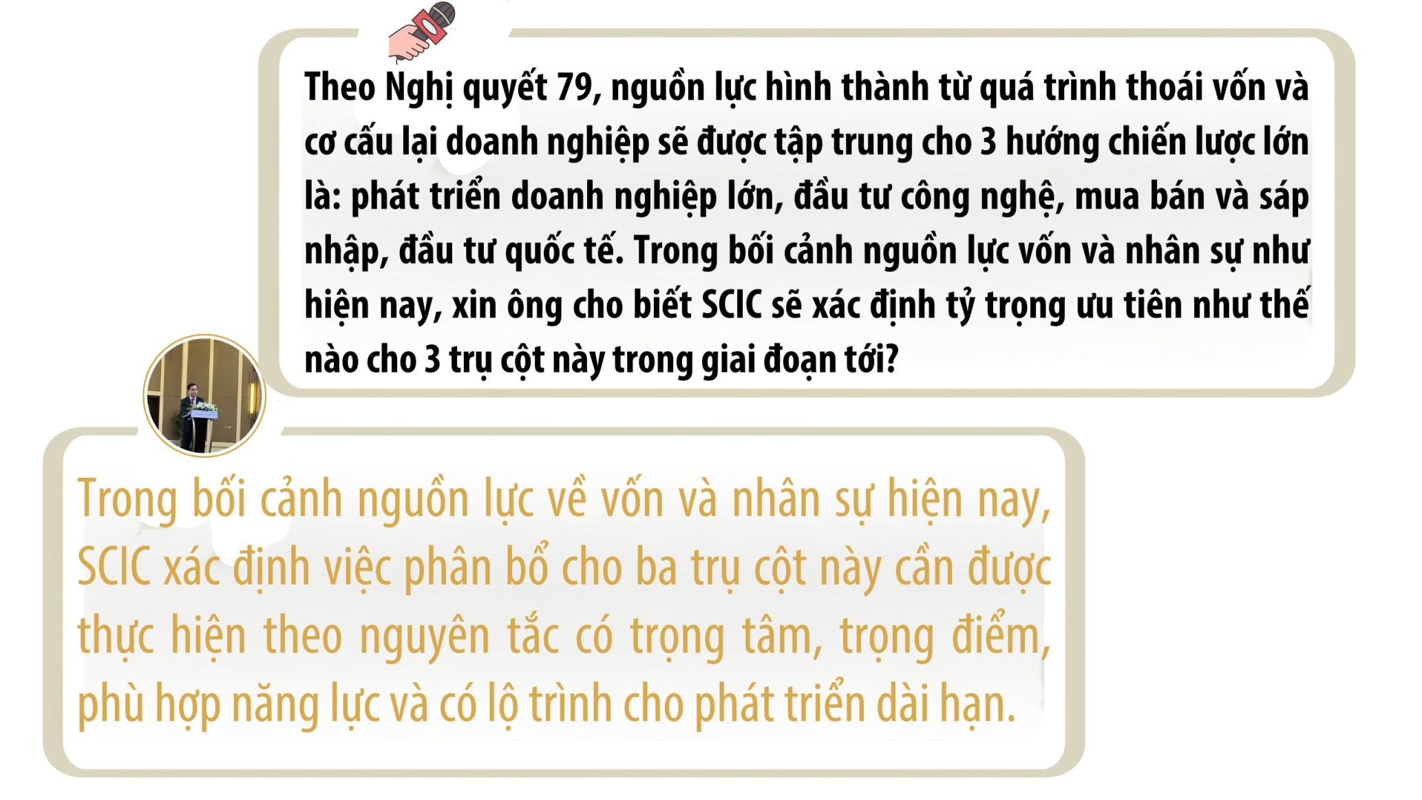 Tóm lại, trong giai đoạn tới, tỷ trọng ưu tiên của SCIC sẽ mang tính linh hoạt tùy từng thời kỳ, trong đó trụ cột phát triển doanh nghiệp lớn giữ vai trò nền tảng; đầu tư công nghệ được tăng dần theo năng lực; còn mua bán-sáp nhập M&A và đầu tư quốc tế được triển khai có chọn lọc, từng bước. Việc điều chỉnh tỷ trọng giữa ba trụ cột sẽ được SCIC thường xuyên rà soát, cập nhật, bảo đảm phù hợp với nguồn lực thực tế, yêu cầu phát triển và mục tiêu dài hạn theo tinh thần Nghị quyết 79-NQ/TW.