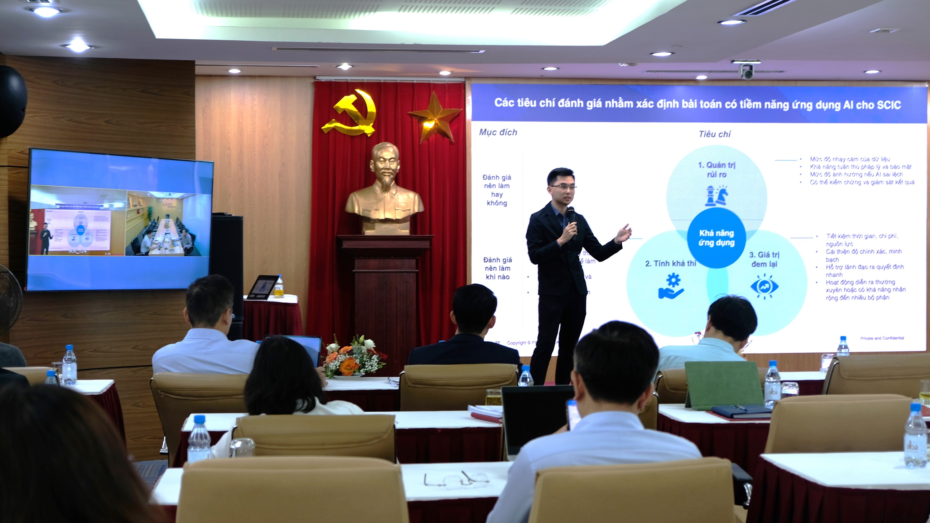 Nhận thức được tầm quan trọng đó, hôm nay SCIC đã phối hợp với tập đoàn FPT tổ chức buổi chuyên đề “Chuyển đổi số và ứng dụng trí tuệ nhân tạo tại SCIC”. Với mục đích nâng cao nhận thức và tầm nhìn chiến lược về AI và chuyển đổi số cho đội ngũ lãnh đạo tại SCIC trong bối cảnh quản lý và kinh doanh vốn nhà nước, đồng thời hỗ trợ xây dựng nền tảng cho việc hoạch định các kế hoạch số hóa và ứng dụng công nghệ để SCIC thích ứng và làm chủ công nghệ trong thời đại mới.