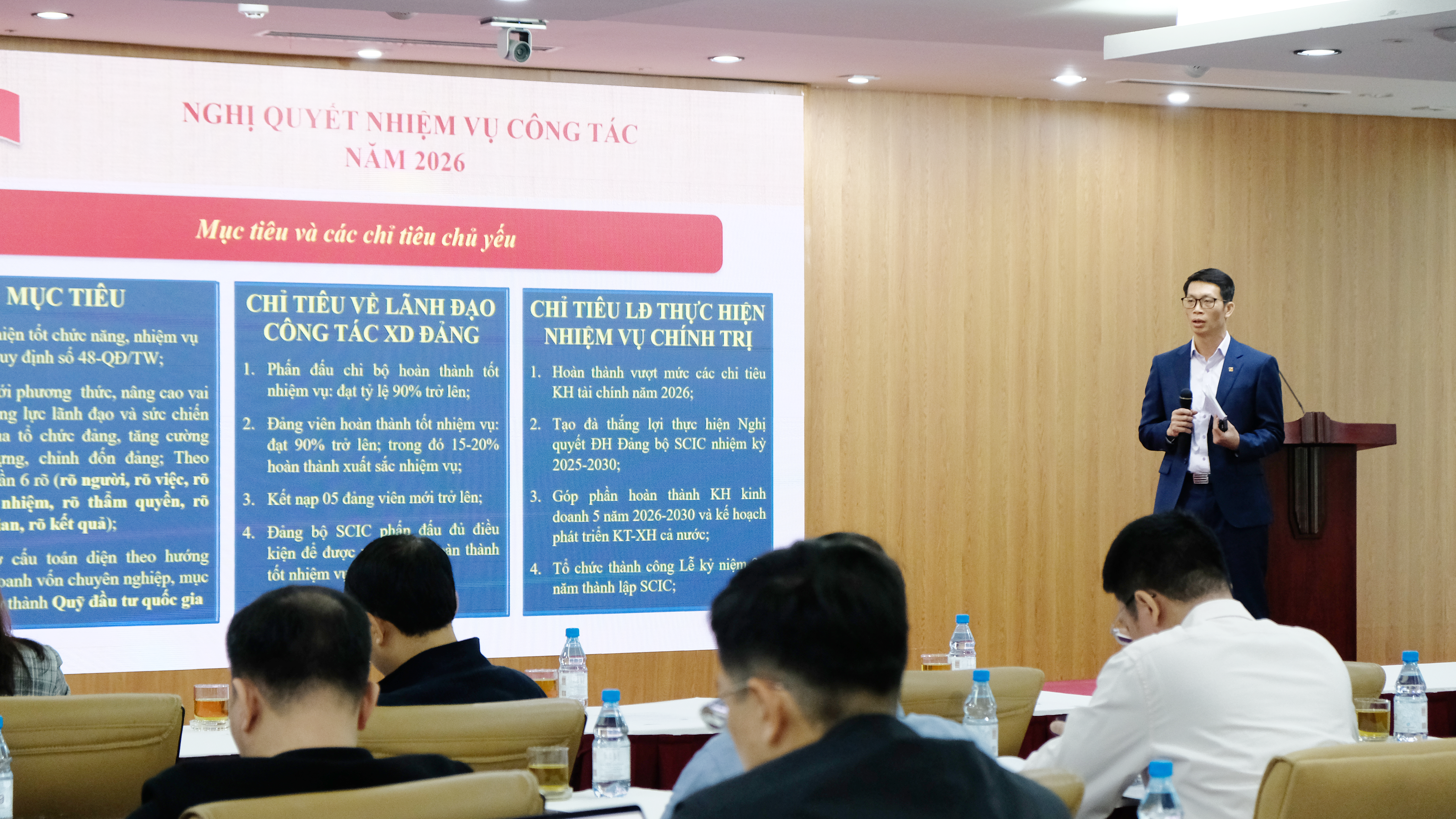 Nghị quyết đề ra các chỉ tiêu cụ thể về lãnh đạo công tác xây dựng Đảng và thực hiện nhiệm vụ chính trị, trong đó phấn đấu trên 90% chi bộ và đảng viên hoàn thành tốt nhiệm vụ; kết nạp từ 05 đảng viên mới trở lên; hoàn thành vượt mức các chỉ tiêu kế hoạch tài chính năm 2026; tạo đà thực hiện thắng lợi Nghị quyết Đại hội Đảng bộ SCIC nhiệm kỳ 2025–2030; góp phần hoàn thành Kế hoạch kinh doanh 5 năm 2026-2030 và kế hoạch phát triển kinh tế - xã hội cả nước; tổ chức thành công các sự kiện lớn, đặc biệt là Lễ kỷ niệm 20 năm thành lập SCIC…