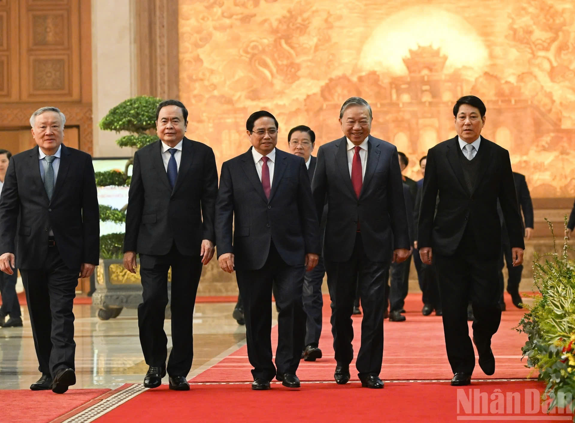 Tổng Bí thư Tô Lâm, Chủ tịch nước Lương Cường, Thủ tướng Phạm Minh Chính, Chủ tịch Quốc hội Trần Thanh Mẫn dự Hội nghị.