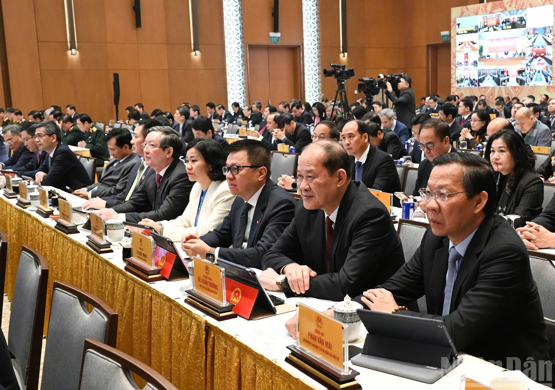 Tổng Bí thư Tô Lâm, Chủ tịch nước Lương Cường, Thủ tướng Phạm Minh Chính, Chủ tịch Quốc hội Trần Thanh Mẫn, Thường trực Ban Bí thư Trần Cẩm Tú, Phó Thủ tướng Thường trực Nguyễn Hòa Bình dự Hội nghị.